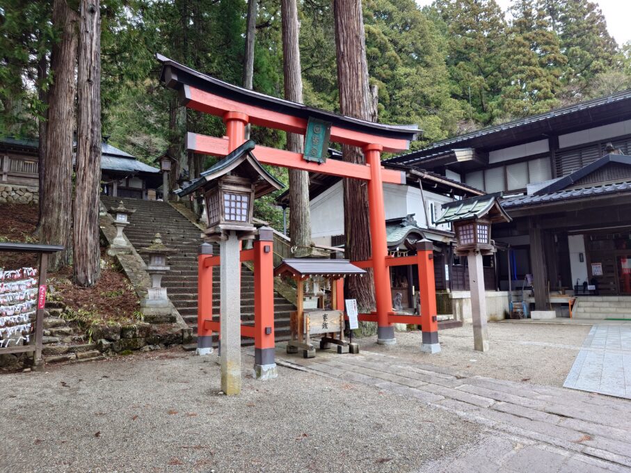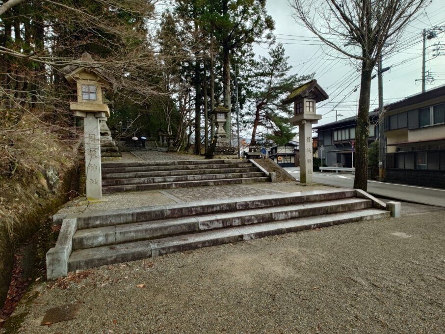 見上げるような石段と、鮮やかな赤い鳥居。 明後日の「生きびな祭り」の舞台となる水無神社とはまた違う、静謐で厳かな空気感があります。ここで静かに手を合わせ、今回の旅の安全を祈願しました。