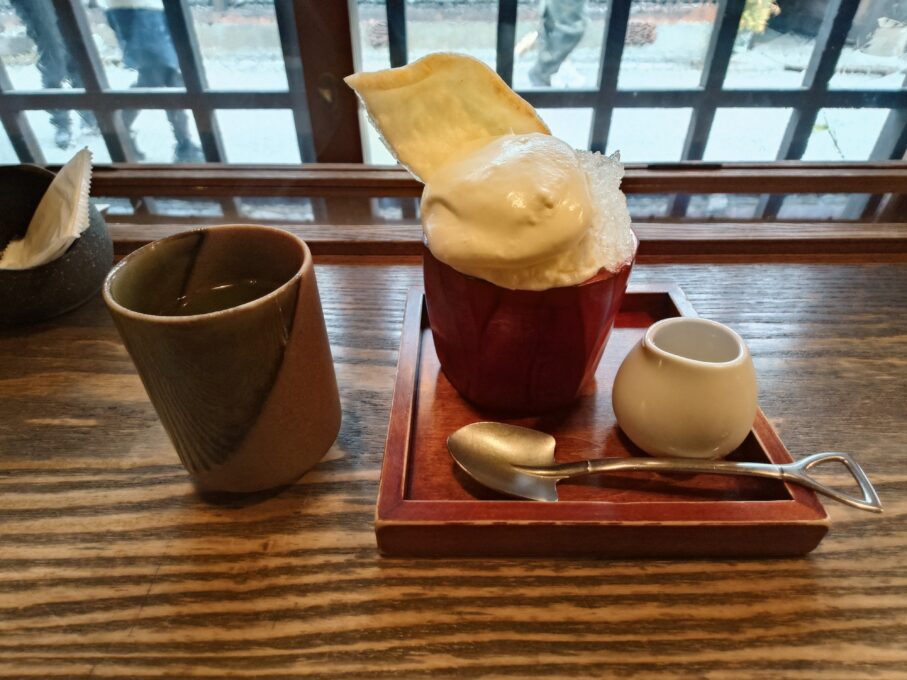 ここでのお目当ては、作品ファンならずとも味わってほしい**「和風パフェ 雪どけ」。 その名の通り真っ白な雪を冠したようなパフェに、温かい甘酒**を回しかけながらいただきます。