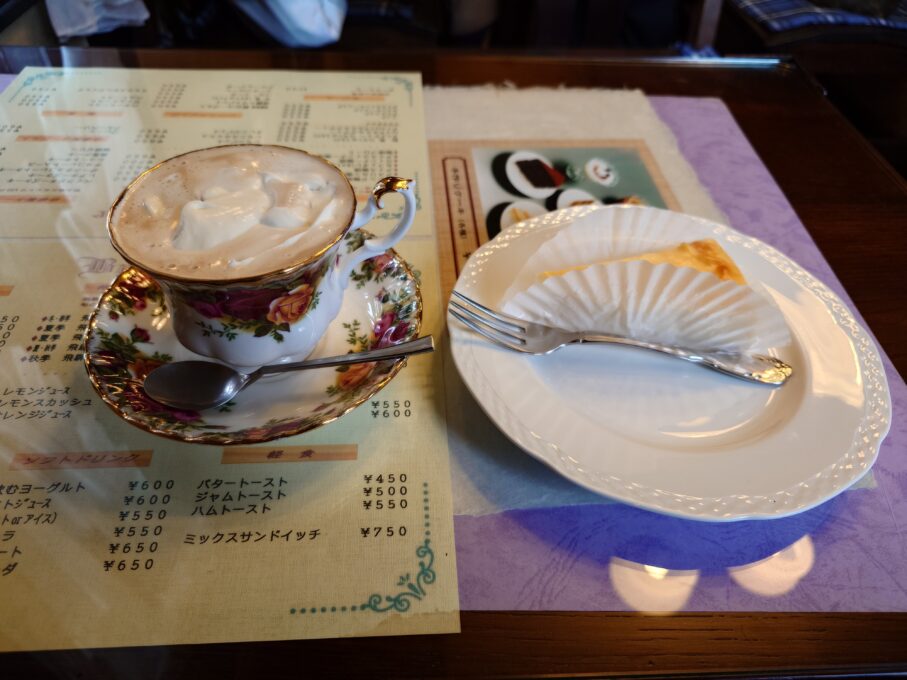 千反田えるが飲んでいたウインナーコーヒーを注文。あわせて、ベイクドチーズケーキもいただきました。