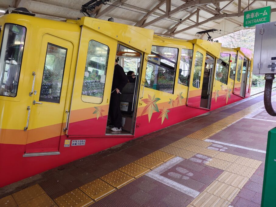 黄色い車体に紅葉の意匠が施された車両は、新緑の季節にもよく映えます。急勾配をぐんぐんと登っていく力強さは、何度乗ってもワクワクするものです。ケーブルカーを降りた先では、力強く根を張る「たこ杉」の巨木からパワーをいただきました。