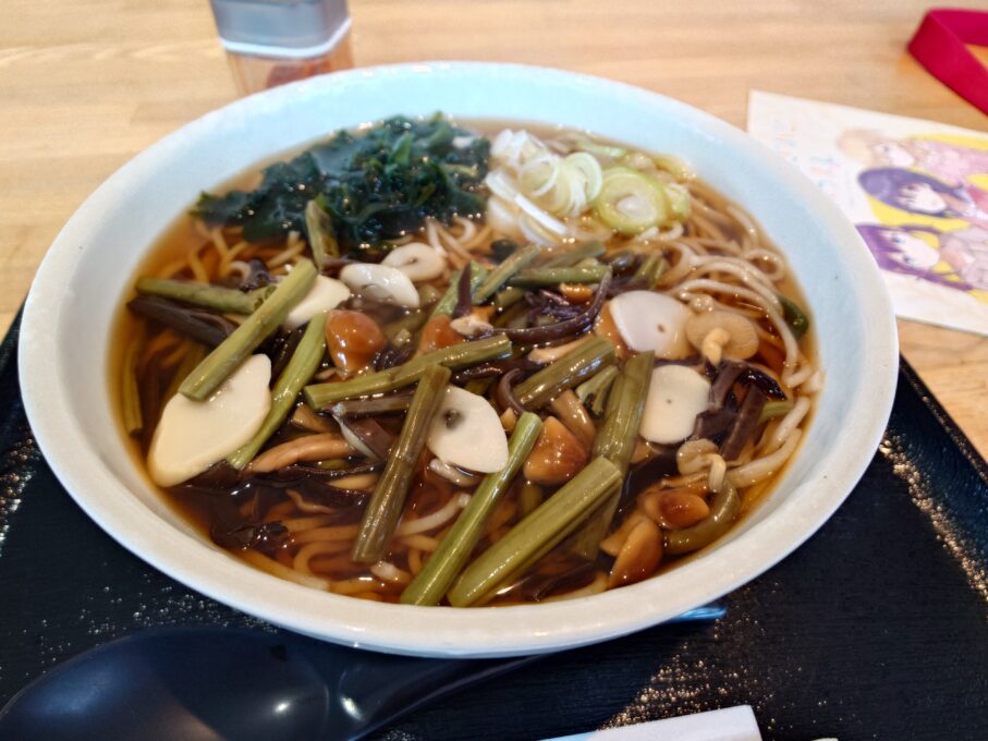 迷わず山菜そばを注文しました(980円)。どんぶり一杯に広がる、たっぷりの山菜とキノコ。シャキシャキとした食感と、出汁の優しい香りが五臓六腑に染み渡ります。これぞ高尾山、これぞ春の贅沢です。