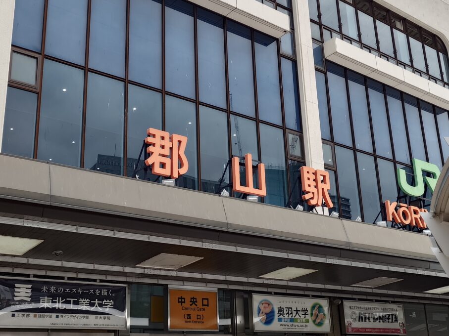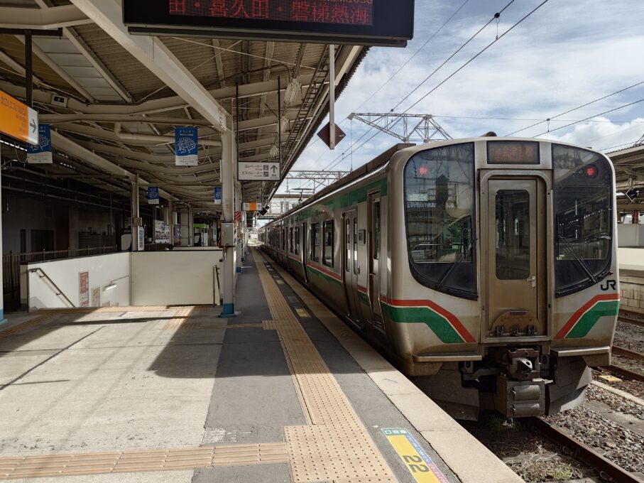 郡山駅に到着すると、鮮やかなオレンジ色の駅名標が迎えてくれます。ここから磐越西線に揺られること約1時間。