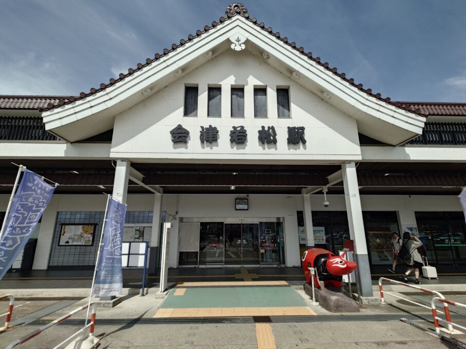 車窓に広がる福島の豊かな山々を眺めていると、旅情がぐっと高まります。会津若松駅では、大きな赤べこが「おたてまえ(お迎え)」してくれますよ。
