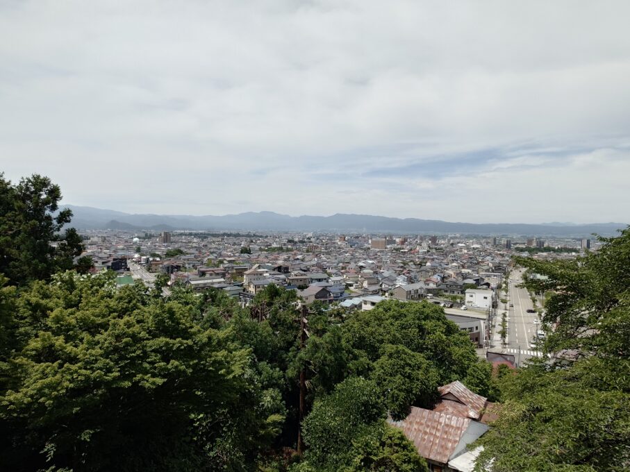鶴ヶ城を望む展望 山頂付近からは、会津の街を一望できます。かつて少年たちが燃え盛る城下を見て絶望した場所ですが、現在は平和な街並みが広がっています。